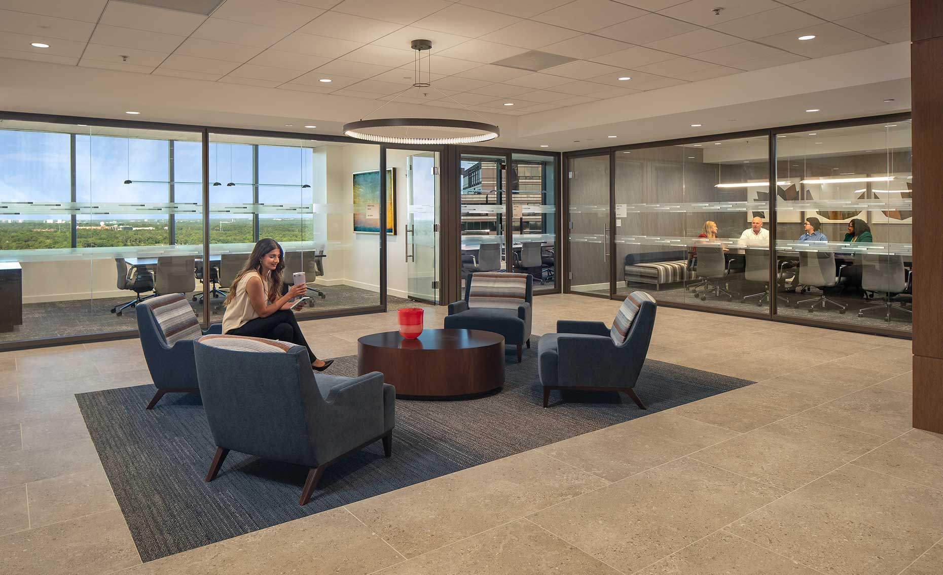 A view of people in an open reception area and conference room within a corporate office building.