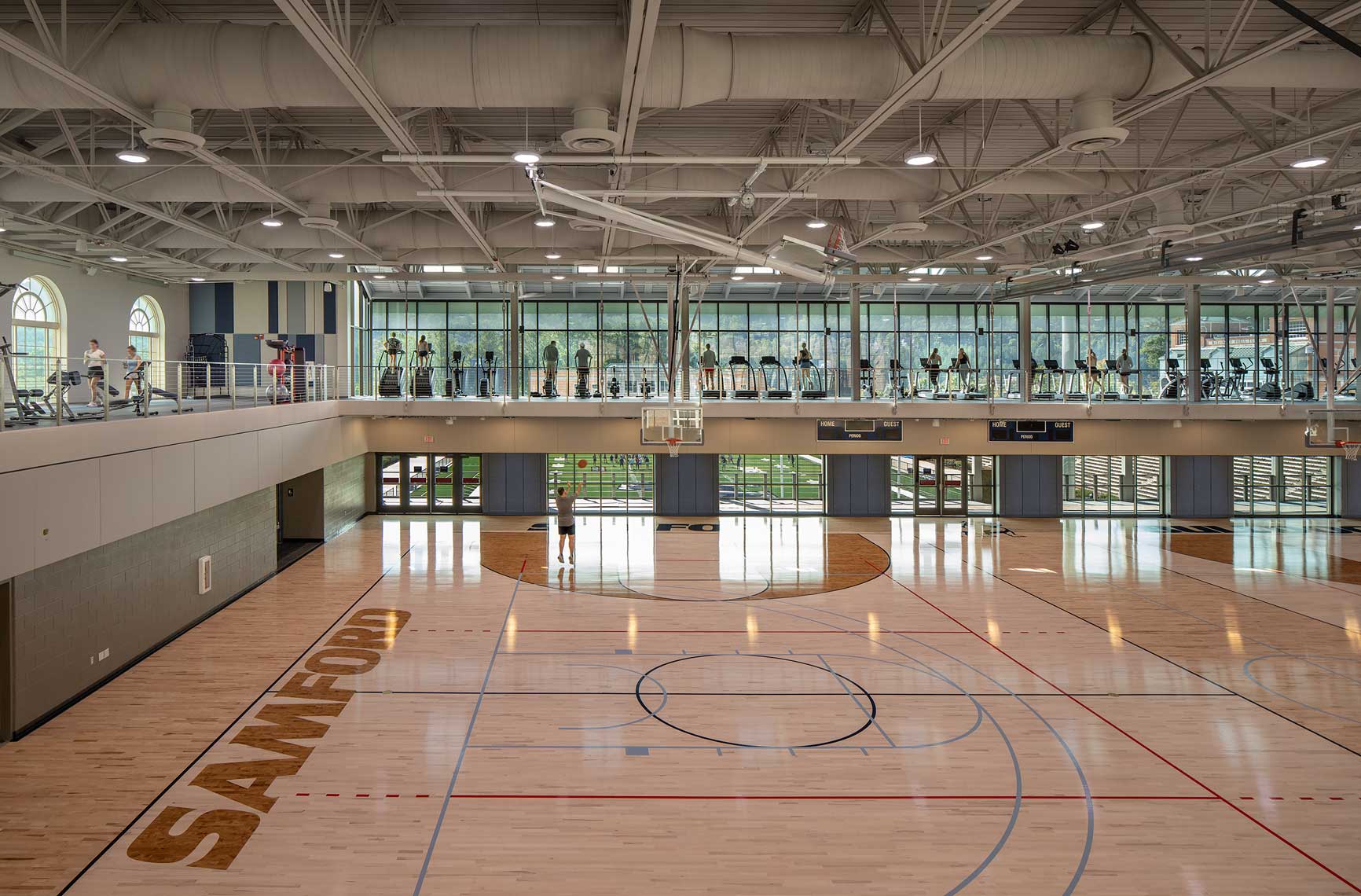 An indoor photo of the basketball courts in Seibert Hall at Samford University, showing its relationsh.ip with the exercise area, track, and outdoor to the football field