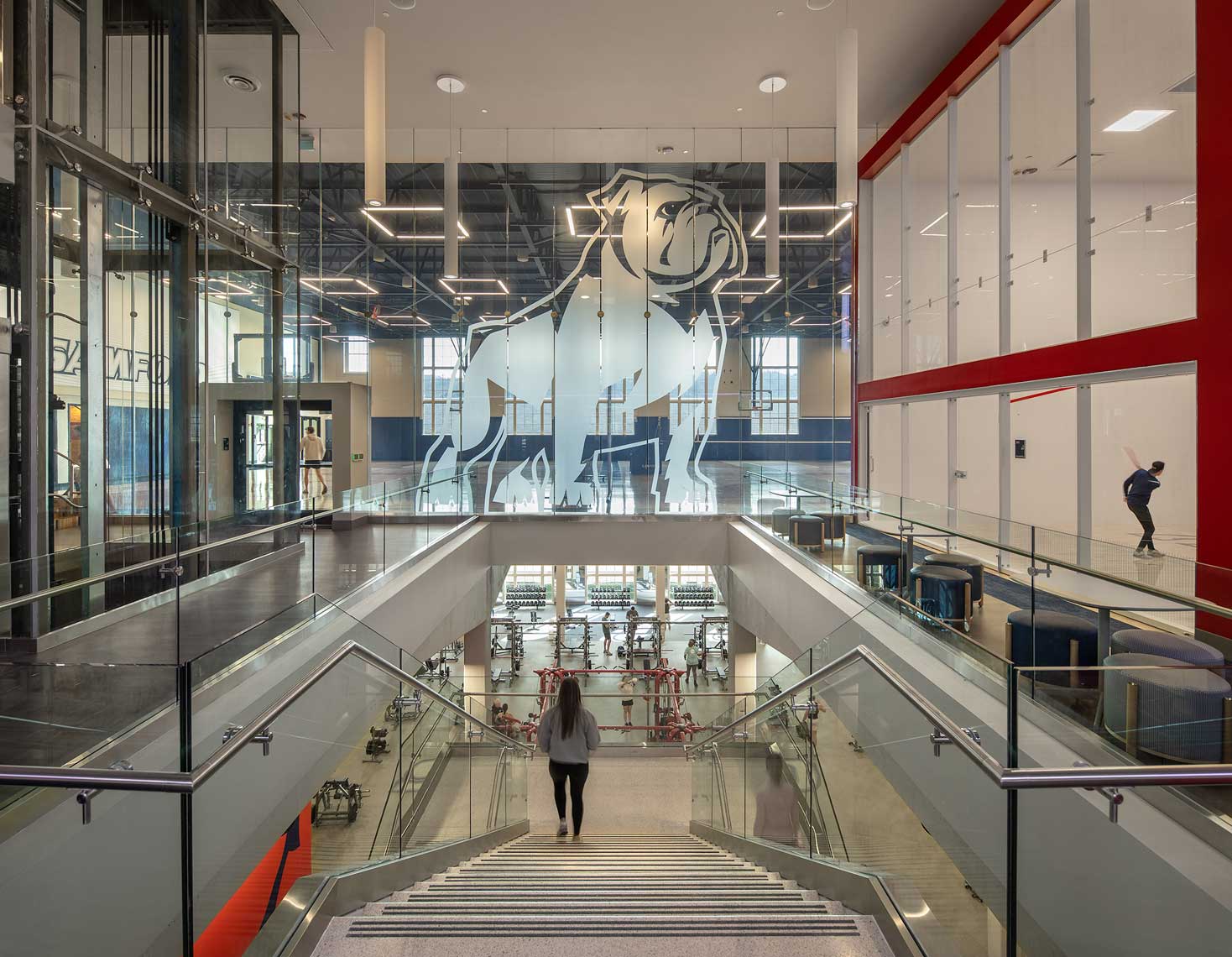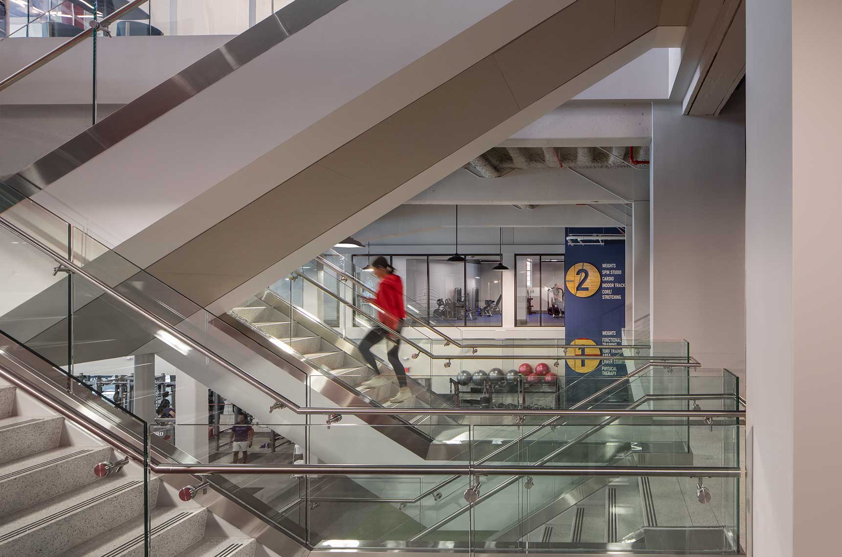 A student athlete descends the stairs in the striking University of Alabama Training Facility Lobby