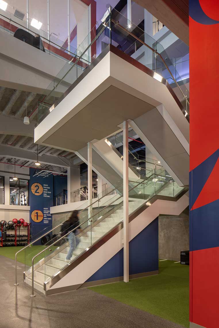 An interior photograph of an open stairway in Seibert Hall at Samford University, showing the stairway in relation to the surrounding exercise spaces.