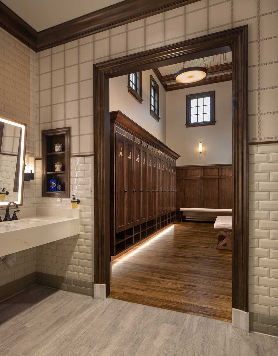 A view of the men's locker room at the University of Alabama Golf Practice Facility, highlighting the wood lockers, sink area, and custom finishes.