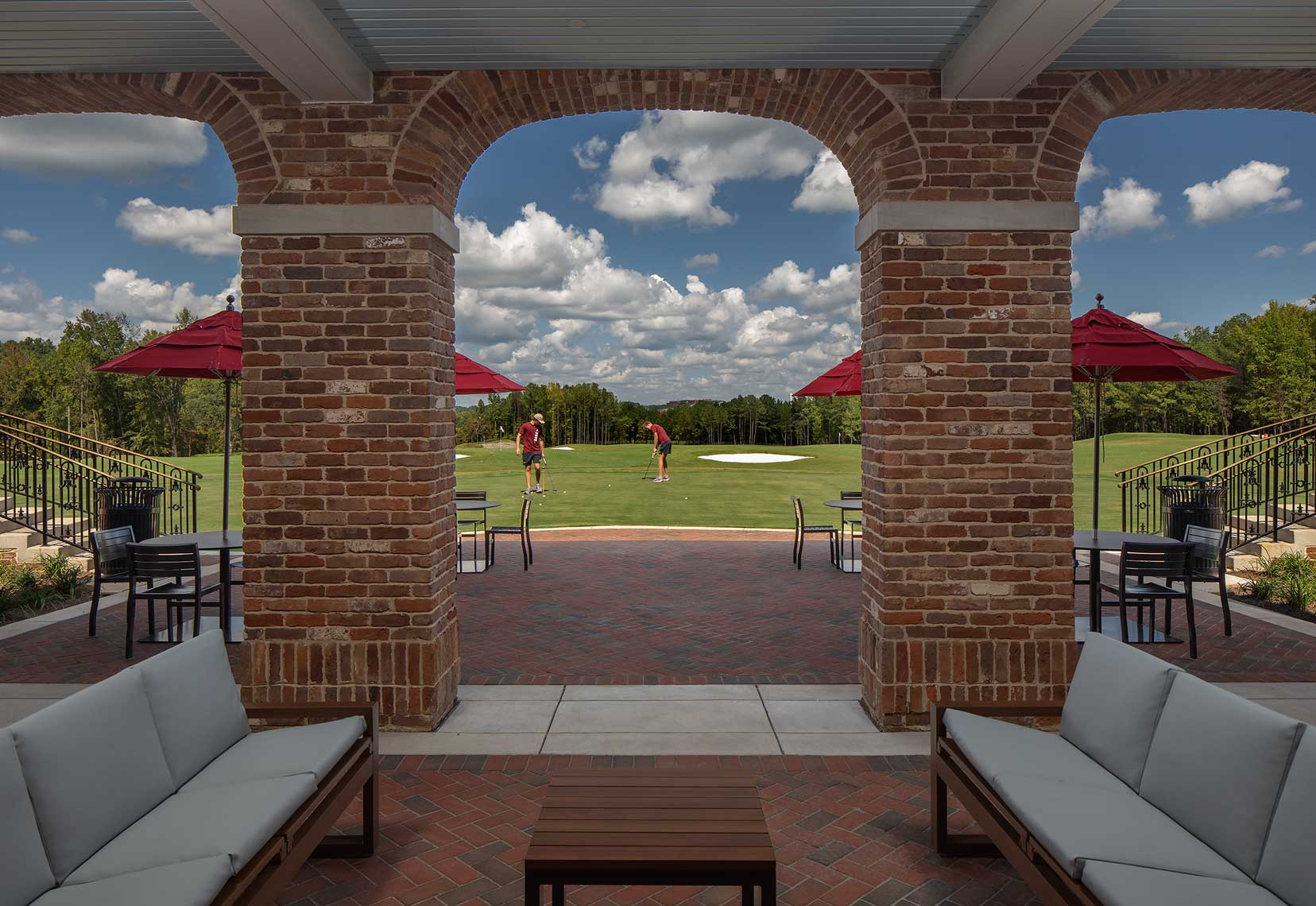 A view through brick arches of a shaded patio showing student athletes practicing at the University of Alabama Golf Practice Facility on a beautiful afternoon