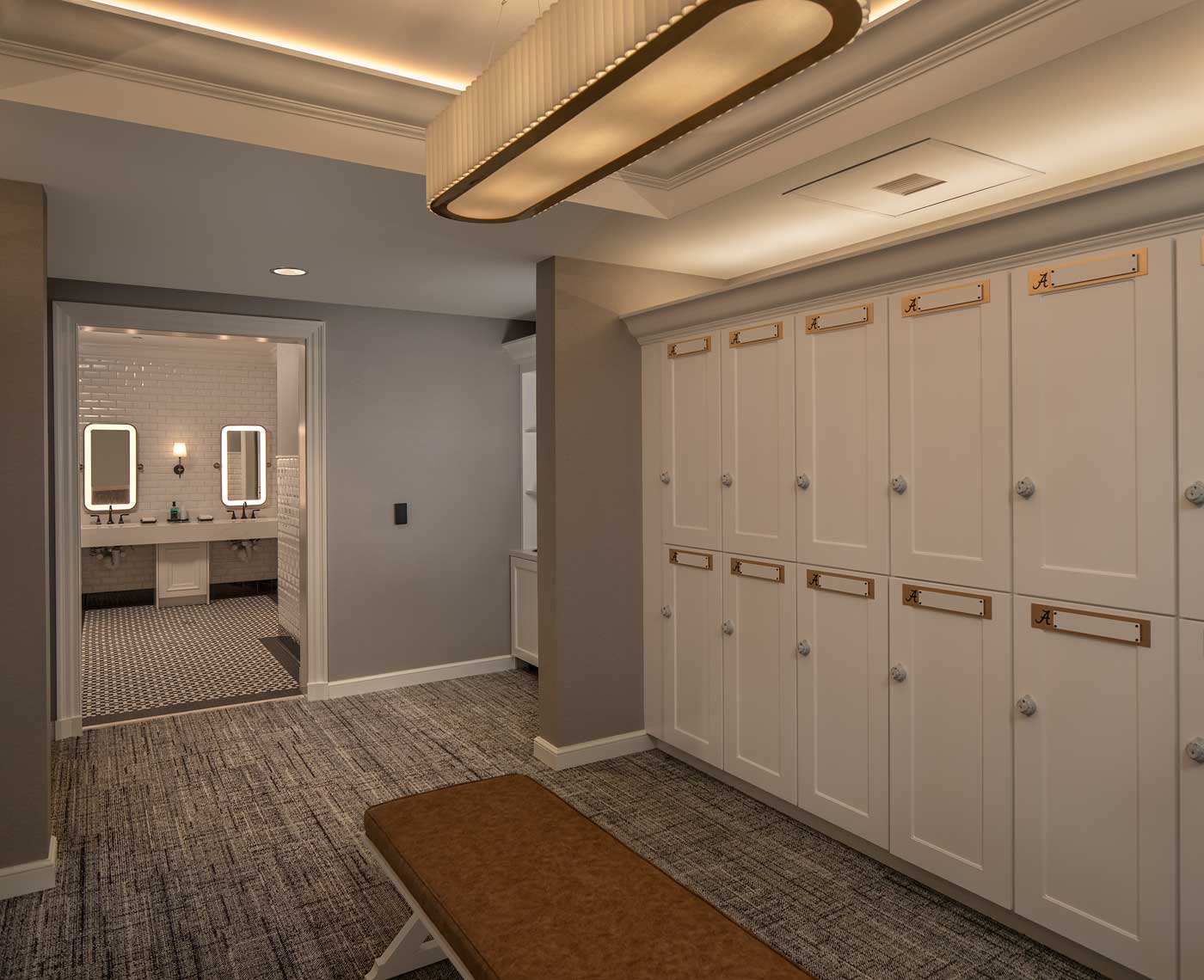A view inside the women's locker room at the University of Alabama Golf Practice Facility showing lockers, sink area, and finish materials.