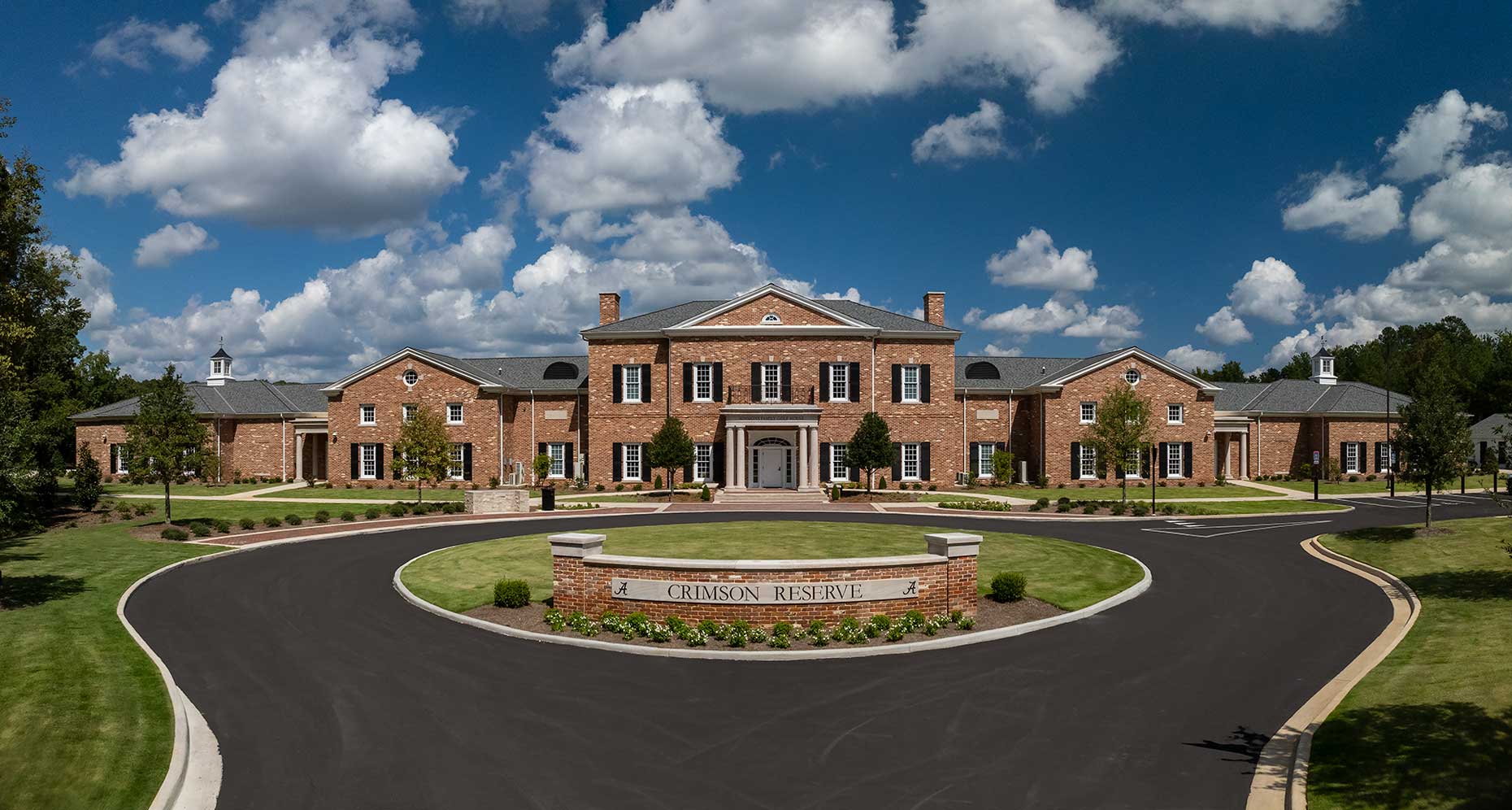 A slightly elevated head-on view of the approach and entry of the Crimson Reserve building at the University of Alabama Golf Practice Facility
