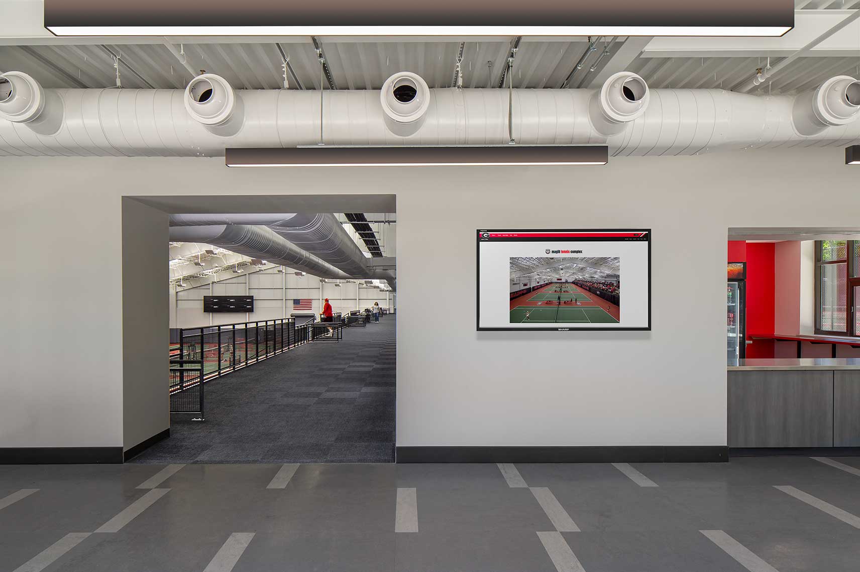 A view of the concessions area and spectator overlook at the University of Georgia Indoor Tennis Facility, showing how exposed air-handling materials were handled aesthetically.